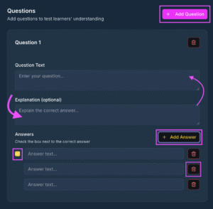 In the Add Question box enter the first question in the “Question text” section. Enter in the Answers in the multiple choice answers section and select the correct answer for the system to show the learner the correct answer. Add add another Question to your lesson just click the Add Question button